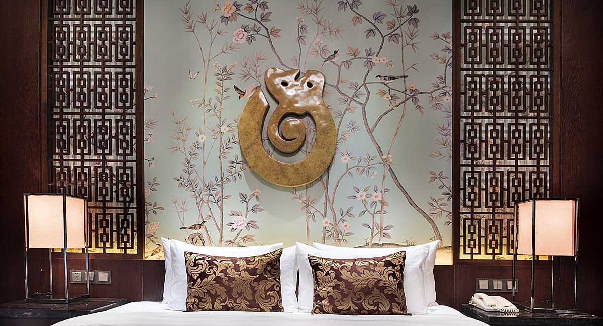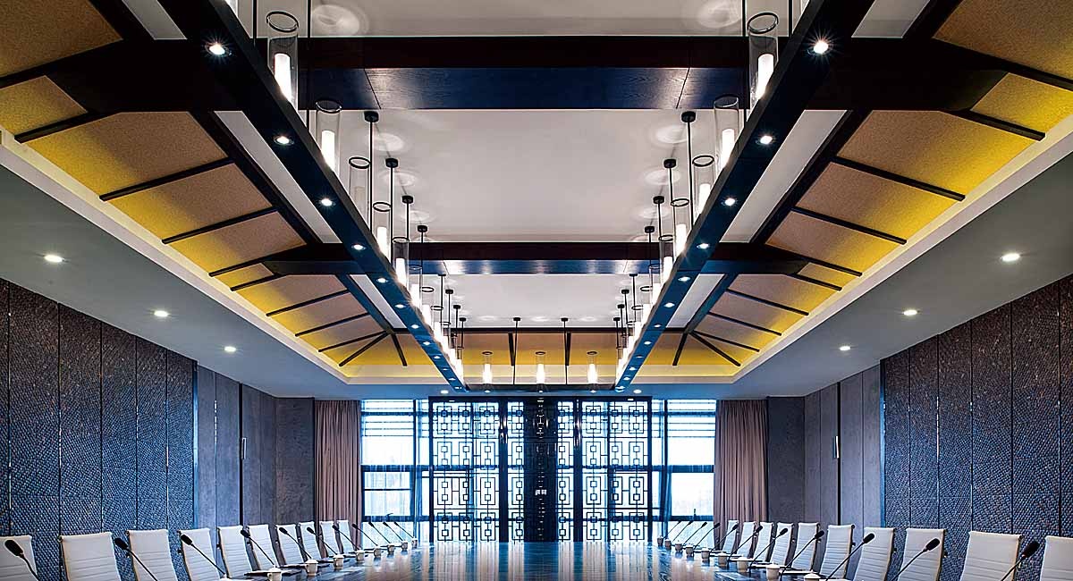 藍溪度假大酒店以中國傳統(tǒng)文化“福”文化展開,以此來呼應(yīng)酒店外圍環(huán)境的“壽字湖”,以“壽”字提煉的金屬花格用于床頭背景,頗具中式意境,色彩則以壽比南山取之于“青”,福如東海取之于“藍”做為空間色,與溫馨沉穩(wěn)的木色和墻紙形成一定的統(tǒng)一和變化,將天花處理成四坡頂天花,大大提升了空間高度的視覺印象,層次變得豐富多彩,耐人尋味。