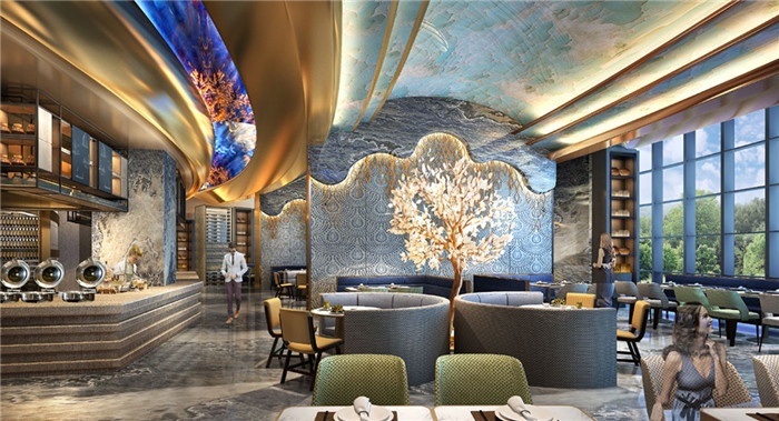 五星級(jí)酒店有許多公共空間,如餐廳、健身房、咖啡廳、書(shū)吧、影音室等,在設(shè)計(jì)師進(jìn)行軟裝配飾設(shè)計(jì)時(shí),一定要事先區(qū)分好這些空間,運(yùn)用家具、燈飾、紡織品、綠植等軟裝配飾來(lái)重組空間結(jié)構(gòu),彌補(bǔ)空間不足,劃分功能區(qū)。